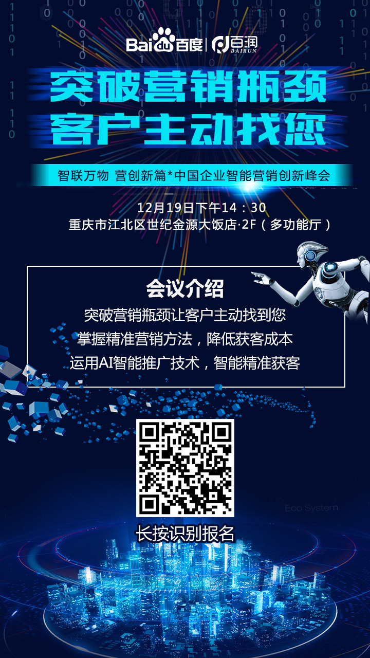2018年12月19日,下午14:30,智聯(lián)萬物 營創(chuàng)新篇-中國企業(yè)智能營銷創(chuàng)新峰會(huì),在重慶市江北區(qū)世紀(jì)金源大飯店·2F(多功能廳)隆重舉行,誠摯邀請(qǐng)您的參與。本次峰會(huì)將為各大企業(yè)及精英共同探討: