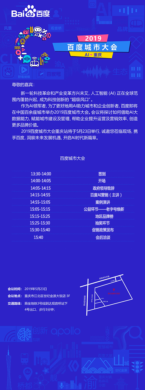 2019年5月23號,百度城市大會在(重慶江北區(qū)觀音橋世紀金源大飯店3樓)下午14:00點隆重舉行,在此誠邀您蒞臨現(xiàn)場。屆時我們將會邀請各路行業(yè)精英為您帶來全新城市未來發(fā)展藍圖,為您講解智能互聯(lián)網(wǎng)時代最新的營銷理念。攜手百度,洞察未來市場發(fā)展機遇,賦能AI營銷新能力;攜手百度,洞悉未來城市發(fā)展方向,開啟AI時代新篇章!