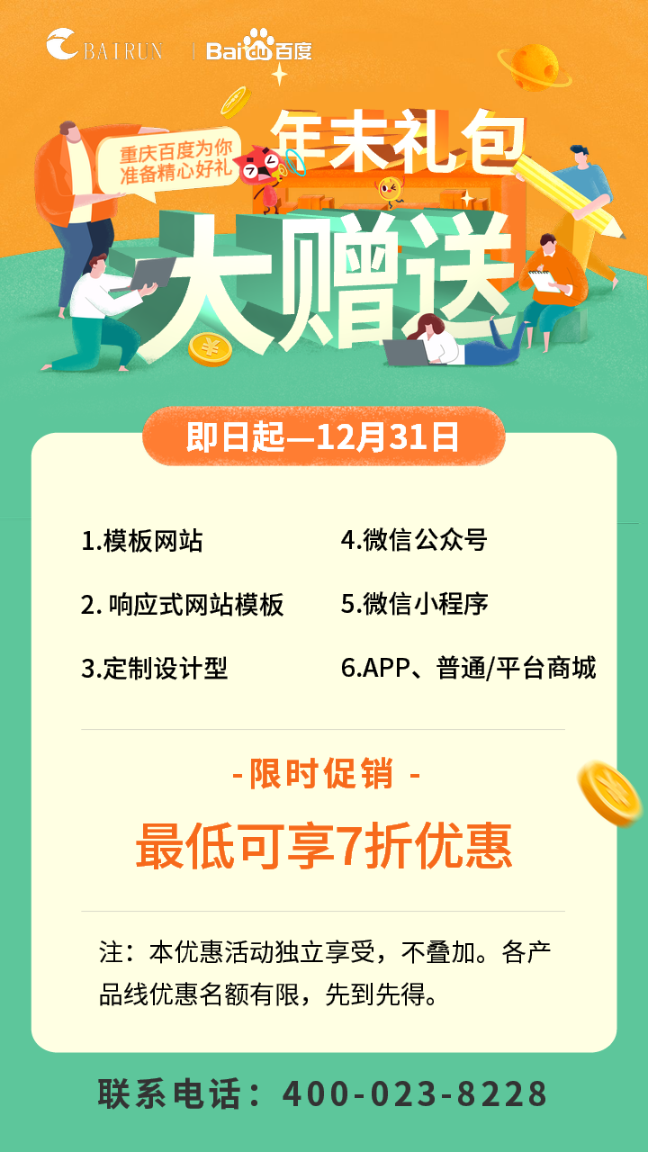不管是網(wǎng)站還是公眾號或者APP對于一個企業(yè)的重要性不言而喻,它們就好比你的門面,一個好的網(wǎng)站可以增加企業(yè)權(quán)威性、全面展示公司產(chǎn)品、降低通信費用等,而一個糟糕的網(wǎng)站則會讓客戶望而卻步,從而流失潛在客戶。但一個好的網(wǎng)站價格也比較高,別擔(dān)心!為回饋新老客戶對我們的支持和信任,重慶百度特精心準(zhǔn)備了年末建站好禮,用最低的價格做最優(yōu)質(zhì)的網(wǎng)站!