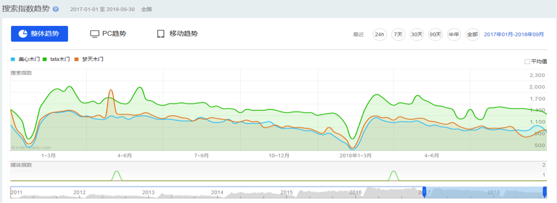 客戶2017年最后季度開始品專推廣,品牌檢索量增高,與同行最大2家競爭者檢索量數(shù)據(jù)持平。明顯提高品牌知名度。